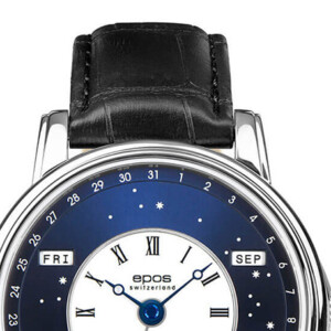 Zegarek męski marki Epos, model 3439.322.20.26.25, zachwyca swoją elegancją i subtelnym designem, co czyni go świetnym wyborem dla każdego dżentelmena ceniącego klasyczne piękno. Epos wykorzystuje ciemną tarczę, która współgra z wyrafinowanym srebrnym wykończeniem koperty oraz luksusowym skórzanym paskiem, dostępnym w różnych kolorach – bieli, czerni, niebieskim i srebrze. Dodatkowo, detal jakim jest transparentny dekiel pozwala podziwiać precyzyjny mechanizm automatyczny, a szafirowe szkło zapewnia doskonałą odporność na zarysowania. Wyróżniające się funkcje, takie jak datownik oraz fazy księżyca, nie tylko dodają praktyczności, ale także zwiększają wizualną wartość tego męskiego akcesorium.