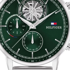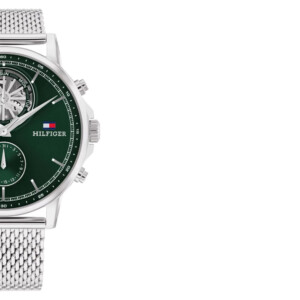 Zegarek męski Tommy Hilfiger model 1710608 doskonale łączy w sobie elegancję i nowoczesny styl, typowy dla marki Tommy Hilfiger, która jest symbolem mody fashion. Ten wyjątkowy czasomierz zawiera stalową, okrągłą kopertę o średnicy 44 mm, która jest zarówno wytrzymała, jak i stylowa dzięki swojemu srebrnemu kolorowi z zielonymi akcentami na tarczy. Bransoleta wykonana ze stali szlachetnej jest nie tylko trwała, ale również dodaje klasy każdemu strojowi, natomiast ciemna tarcza z datownikiem sprytnie kontrastuje, ułatwiając odczytanie godziny. Szkło mineralne odpowiada za ochronę przed zarysowaniami, a wodoodporność do 50 metrów pozwala na pływanie powierzchniowe bez obaw o uszkodzenie. Zegarek ten idealnie oddaje ducha marki Tommy Hilfiger, łącząc funkcjonalność z modnym designem.