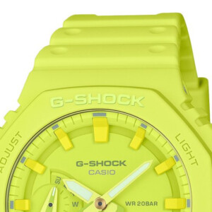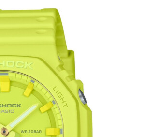 Zegarek męski G-shock model GA-2100-9A9 to kwintesencja sportowego stylu oraz wytrzymałości. Charakteryzuje się on zieloną, okrągłą kopertą o średnicy 45mm, wykonaną z trwałego tworzywa sztucznego, która doskonale komponuje się z elastycznym, gumowym paskiem. Ciężko przeoczyć jego ciemną, podświetlaną tarczę, którą uzupełniają fluorescencyjne wskazówki i indeksy, zapewniające doskonałą czytelność nawet w głębokich ciemnościach. Wodoodporność na poziomie 200 metrów wspólnie z mineralnym szkłem skutecznie chronią mechanizm kwarcowy zasilany baterią przed uszkodzeniami. Sportowy charakter tego modelu uzupełniony jest o szereg zaawansowanych funkcji takich jak alarm, chronograf, timer oraz datownik, co sprawia, że G-shock GA-2100-9A9 jest idealnym towarzyszem dla aktywnych mężczyzn w różnorodnych warunkach.
