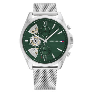 Zegarek męski Tommy Hilfiger model 1710647 to kwintesencja stylu Fashion, który łączy w sobie elegancję i nowoczesność. Jego okrągła koperta o średnicy 44mm, wykonana z trwałej stali szlachetnej, harmonijnie komponuje się z ciemną tarczą i stylową, srebrno-zieloną kolorystyką. Niebanalny charakter zegarka podkreśla bransoleta, również wykonana ze stali szlachetnej, która dodaje całości wytwornego wyglądu. Mineralne szkło zabezpiecza tarczę, a dodatkowe funkcje takie jak datownik i Open Heart wzbogacają użytkowanie, oferując nie tylko praktyczność, ale także wyjątkowy element dekoracyjny. Model ten doskonale oddaje ducha marki Tommy Hilfiger, łącząc amerykański luz z elegancją, idealny dla mężczyzn ceniących fashionowe akcenty w codziennym ubiorze.