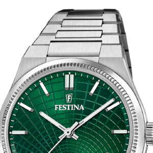Elegancja i precyzja definiują męski zegarek Festina model F20051/5, będący znakomitym wcieleniem know-how i stylu marki znanej z wysokiej jakości. Wykonana z nierdzewnej stali, okrągła koperta o średnicy 40mm i grubości 8mm, w połączeniu z srebrnym paskiem bransoletowym, podkreśla klasyczny, ale zarazem nowoczesny design. Zielona tarcza z liniowymi indeksami i zdobieniem typu guilloche dodaje głębi i charakteru, a datownik oraz luminova na wskazówkach/indeksach zwiększają funkcjonalność i czytelność. Zakręcany dekiel oraz wodoodporność do 100m czynią go idealnym wyborem dla aktywnych i wymagających mężczyzn szukających klasycznej elegancji w codziennym użytkowaniu.
