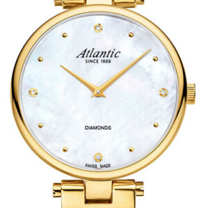 Zegarek damski Atlantic model 29044.45.07GMB to esencja elegancji i style, w którego designie dominują zarówno klasyka, jak i nowoczesne elementy. Okrągła, wykonana z wysokiej jakości stali szlachetnej koperta o średnicy 33 mm harmonijnie komponuje się z dwukolorową, srebrno-złotą bransoletą, dodając całości dystyngowanego charakteru. Jasna tarcza zdobiona masą perłową i diamentami/brylantami podkreśla luksusowy styl Fashion, odzwierciedlający filozofię marki Atlantic, która stawia na niezmienną jakość i prestiż. Szafirowe szkło zwiększa trwałość i odporność zegarka na zarysowania, co czyni ten model idealnym wyborem dla kobiet ceniących sobie zarówno estetykę, jak i funkcjonalność.