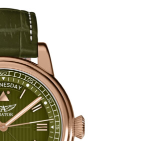 Zegarek męski Aviator o modelu V.3.35.2.279.4 to wyjątkowy przykład połączenia funkcjonalności z elegancją. Koperta ze stali szlachetnej w kolorze różowego złota i zielona tarcza dodają urządzeniu wyrafinowanego charakteru. Ciemne, szafirowe szkło odporne na zarysowania oraz wodoodporność do 100m gwarantują nie tylko doskonałą czytelność, ale i trwałość na długie lata. Pasek ze skóry naturalnej, średnica koperty 41mm i okrągły kształt nadają zegarkowi klasycznego, ale zarazem nowoczesnego wyglądu, który idealnie współgra z funkcjami takimi jak datownik oraz fluorescencyjne wskazówki i indeksy, zapewniające czytelność w każdych warunkach. To doskonały wybór dla mężczyzny szanującego tradycyjną elegancję wzbogaconą o nowoczesne rozwiązania.