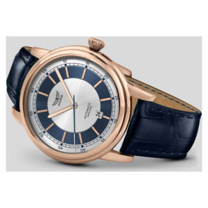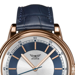 Model V.3.32.2.270.4 to kwintesencja lotniczego stylu, łączący w sobie elegancję z nowoczesną technologią. Zegarek posiada obudowę wykonaną ze stali szlachetnej o średnicy 45 mm, którą uzupełnia nietypowa, różowa kolorystyka koperty. Śrebrna tarcza z liniowymi indeksami, zdobiona techniką gilosz, współgra z niebieskim paskiem skórzanym, nadając zegarkowi wyjątkowego charakteru. Szafirowe szkło gwarantuje nie tylko doskonałą czytelność, ale także odporność na zarysowania. Dodatkowy prestiż zapewnia limitowana edycja tego modelu, który wyróżnia się funkcjonalnością - m.in. datownikiem i zakręcanym deklem z funkcją transparentnego wyświetlacza mechanizmu.