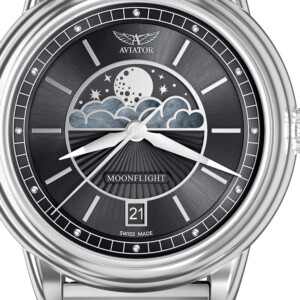 Zegarek damski Aviator o modelu V.1.33.0.252.5 to kwintesencja elegancji zamknięta w klasycznej, okrągłej kopercie o średnicy 36mm, wykonanej z wysokiej jakości stali szlachetnej. Ten model cechuje się wykwintnym połączeniem czarnego koloru tarczy z srebrnym wykończeniem, które przykuwa wzrok i dodaje uroku. Zegarek wyposażono w funkcje datownika i faz księżyca, co nie tylko jest praktyczne, ale również wzbogaca estetykę tarczy. Światłonośne wskazówki i indeksy umożliwiają łatwe odczytywanie czasu nawet w słabym oświetleniu. Szkło szafirowe, znane ze swojej odporności na zarysowania, podkreśla trwałość i jakość, które są znakami rozpoznawczymi marki Aviator.