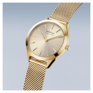Zegarek marki Bering o modelu 17331-333 łączy w sobie estetykę nowoczesnej elegancji z subtelnym luksusem, które odpowiednio reprezentuje renomowaną markę Bering. Jego średnica koperty wynosząca 31 mm oraz grubość 6 mm podkreślają delikatność i precyzję wykonania. Szampański kolor tarczy harmonijnie komponuje się z żółtym kolorem koperty i bransolety, tworząc wyrafinowany akcent wizualny. Szkło szafirowe, odporne na zarysowania, dodatkowo potęguje trwałość oraz elegancję zegarka. Wsparte na solarnej technologii zasilanie podkreśla ekologiczne podejście marki, jednocześnie oferując użytkownikom wygodę i niezawodność. Te cechy czynią go idealnym wyborem dla osób ceniących sobie klasę i trwałość z umiarem.