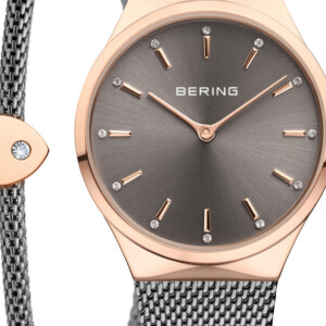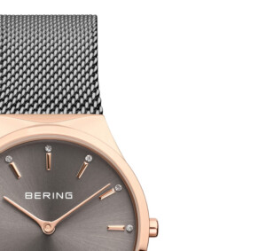 Zegarek damski Bering o modelu 12131-369-GWP to kwintesencja elegancji w minimalistycznym stylu, który podkreśli każdą damską stylizację. Wykonana ze stali szlachetnej okrągła koperta w kolorze różowego złota, pokryta metodą PVD/IP, dodaje luksusowego charakteru, a ciemna tarcza doskonale kontrastuje z jasnym blaskiem metali. Bransoleta w odcieniach szarego i różowego złota idealnie komponuje się z delikatną średnicą koperty wynoszącą 30mm, tworząc zgrany i modny akcent na nadgarstku. Fashionowy design zegarka jest dopełniony przez szkło szafirowe, które nie tylko zabezpiecza przed zarysowaniami, ale także dodaje elegancji oraz wyrafinowania każdemu elementowi tego modelu.