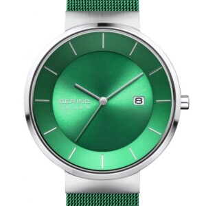Bering SOLAR 14639-CHARITY to damask model o niezaprzeczalnym uroku. Posiada wyjątkową zieloną tarczę z wgłębieniem, która wygląda jakby cały czas zwracała się ku słońcu. Intensywna zieleń jest dominującym elementem tego zegarka. Jego minimalizm skupia się na ukazaniu nieskazitelnej, otwartej przestrzeni. Proste linie wskazówek, datownik i napis nie zaburzają tej ascetycznej ciszy. Srebrna koperta oraz delikatna, pleciona bransoleta dopełniają ta piękną kompozycję.Bering SOLAR 14639-CHARITY to zegarek o wyjątkowym stylu fasion. Może być doskonałym, ekskluzywnym dodatkiem do modowych stylizacji. Jego szafirowy blask dopełni letnią, jednolitą kolorystycznie kreację lub powieli kolor kwiatowego printu. Ten wspaniały damski zegarek wygląda jak klejnot i może z powodzeniem być jedyną biżuteryjną ozdobą. Nosząc taki zegarek można być pewną, że zwróci on na siebie uwagę wszystkich patrzących. Bering SOLAR 14639-CHARITY został zaprojektowany dla kobiety, która pragnie być otoczona dobroczynną poświatą słonecznej zieleni.