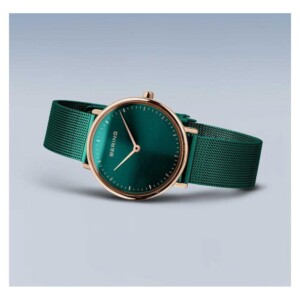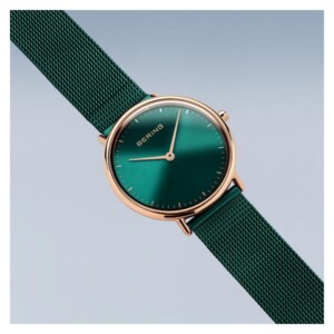 Bering ULTRA SLIM 15729-868 wybierz już dzisiajZakup zegarka Bering ULTRA SLIM 15729-868 to doskonała decyzja konsumencka. Jest to wyrób elegancki i dający wiele radości, rzadko ulegający awariom. Ciemnozielona tarcza i ciemnozielony pasek to doskonała całość. Rozjaśniana jest złotymi wskazówkami oraz indeksami. Prezentują się naprawdę wyjątkowo i dają wiele zadowolenia każdej eleganckiej pani. Ładnie wyglądają noszone z elegancką odzieżą w dobrym stylu. Zegarek ma trzyletnią gwarancję, a to niewątpliwy atut. Piękno w czystej postaci jest tym, co sprawdza się idealnie. Okrągła koperta, stal szlachetna tworząca trwały wyrób to duże atuty tego wyrobu. Kwarcowy mechanizm zasilany jest baterią. Bransoleta została zamocowana na teleskopach koperty. Model jest bardzo kobiecy i klasyczny.