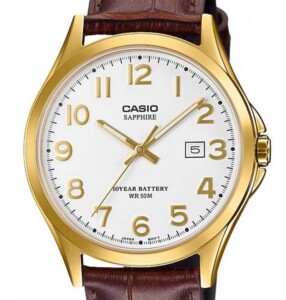 Casio Classic MTP-100GL-7A - wspaniały zegarek męski marki Casio. Jego wygląd jest utrzymany w klasycznym stylu, co może nakłonić do myślenia o przeszłości i zegarkach, które nosili np. arystokraci w dawnych czasach. Pozłacana koperta oraz skórzany pasek idealnie dopełniają całość urządzenia.W tym japońskim produkcie czas odmierza niezawodny, najczęściej używany przez producentów czasomierzy, mechanizm kwarcowy, który zasilono wytrzymałą baterią (nawet do 10 lat żywotności). Model Casio Classic MTP-100GL-7A posiada przydatne funkcje, którymi są: datownik, fluorescencyjne wskazówki, a także fluorescencyjne indeksy na tarczy. Wodoszczelność oceniono w klasie 50m, co daje ogromną odporność na zachlapania wodą wszelkiego rodzaju, czy podczas mycia rąk, czy podczas mycia samochodu. Koperta zegarka jest w okrągłym kształcie i wykonana została precyzyjnie za pomocą stali szlachetnej, natomiast jego tarcza pokryta w całości została szkiełkiem szafirowym, odpornym na zarysowania i stłuczenia.