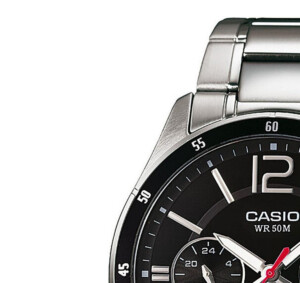 Zegarek męski model MTP-1374PD-1A to wytworny dodatek łączący w sobie elegancką stylizację z nowoczesną technologią. Okrągła koperta o średnicy 43mm idealnie komponuje się z męskim nadgarstkiem, nadając zegarkowi prestiżowego wyglądu. Ciemna tarcza, w połączeniu z srebrno-czarną bransoletą ze stali szlachetnej, podkreśla jego modny, fashion'owy charakter. Zastosowane szkło mineralne zapewnia wytrzymałość i odporność na zarysowania. Dopełnieniem całości jest funkcjonalność - wodoodporność do 50m pozwala na pływanie powierzchniowe, a fluorescencyjne wskazówki oraz indeksy ułatwiają odczyt w ciemności. Ten zegarek jest idealnym wyborem dla mężczyzn ceniących sobie funkcjonalność i modny styl.