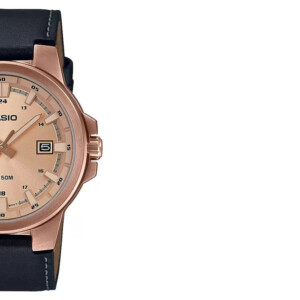 Zegarek męski Casio model MTP-E173RL-5A łączy w sobie elegancję oraz współczesny design, który idealnie wpisuje się w modny styl fashion. Wykonany ze stali szlachetnej z okrągłą kopertą o średnicy 42mm oraz jasną tarczą, zegarek prezentuje wyrafinowane połączenie czarnego koloru z akcentami różowego złota, które dodaje urządzeniu luksusowego wyglądu. Komfort noszenia zapewnia wysokiej jakości skórzany pasek, który dodatkowo podkreśla stylowy charakter zegarka. Dodatkowo, szkło mineralne zapewnia odpowiednią ochronę przed zarysowaniami, a wytrzymałość na wodę do 50 metrów umożliwia użytkowanie podczas pływania powierzchniowego. Zegarek zawiera też datownik, co podnosi jego funkcjonalność, jednocześnie zachowując modny design.