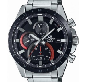 Casio Edifice EFR-571DB-1A1 - nietypowa tarcze tego męskiego zegarka marki Casio nadaje mu ogromnej efektywności i uroku. Producenci tego urządzenia zadbali o jego bardzo rozbudowaną technologię oraz o wiele przydatnych funkcji, z którymi zaraz sam się zapoznasz!Wodoszczelność czasomierza scharakteryzowano podczas produkcji w klasie 100m, co umożliwia nurkowanie bez aqualungu, wraz z zegarkiem na nadgarstku. Model Casio Edifice EFR-571DB-1A1 oryginalnie wyposażony został w wiele przydatnych funkcji, którymi są: stoper, datownik, fluorescencyjne wskazówki, a także fluorescencyjne indeksy na tarczy. Kolor naniesiono na produkt metodą PVD/IP, która jest wyjątkowo trwała i daje odporność na ścieranie nawet do 10 lat. Czas w tym zegarku odmierza najpopularniejszy wśród producentów czasomierzy, mechanizm kwarcowy. Bransoletę i kopertę urządzenia wykonano ze stali szlachetnej, natomiast jego tarczę pokryto w całości lekkim, ale mocnym szkłem mineralnym, które daje odporność na zarysowania oraz stłuczenia.