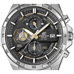 Zegarek Casio Edifice EFR556D1A został wykonany z antyalergicznej stali szlachetnej, nie wywołuje podrażnień skóry. Produkt wyposażony jest w bransoletę. Zegarek dobrze trzyma się na ręce, nie utrudnia ruchów ręki. Zegarek posiada okrągłą kopertę, która najczęściej występuje w zegarkach naręcznych. Średnica koperty wynosi 46 mm. Zegarek posiada ciemną tarczę. Produkt został zaopatrzony w tradycyjny mechanizm kwarcowy, potrzebuje do działania baterie. Tarcza produktu została pokryta szkłem mineralnym, odpornym na zniszczenia, zarysowania. Zegarek umożliwia pływanie, nurkowania bez akwalungu. Produkt posiada datownik ukazujący aktualną datę. Zegarek zaopatrzony jest w stoper, wykonujący precyzyjny pomiar czasu. Zegarek Casio Edifice EFR556D1A świetnie się sprawdzi do sportowych lub eleganckich męskich stylizacji. Producent zapewnia 3 lata gwarancji, dodatkowo jest możliwe zakupienia 3-letniej gwarancji. W zestawie znajduje się zegarek, oryginalne opakowanie, gwarancja, instrukcja obsługi.