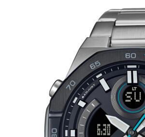 Zegarek Casio model ECB-950DB-1A to doskonały wybór dla entuzjastów stylu sportowego, którzy cenią sobie wysoką jakość i funkcjonalność. Prezentuje się on imponująco dzięki swojej okrągłej, srebrno-stalowej kopercie o średnicy 48mm i grubości 14mm, a także czarnej tarczy, która dodaje klasy. Waga wynosząca 110g zapewnia wygodę noszenia, nie obciążając nadmiernie nadgarstka. Wytrzymała bransoleta ze stali szlachetnej i mineralne szkło zwiększają odporność zegarka na uszkodzenia, co jest idealne dla aktywnie spędzających czas. Dodatkowo, wodoodporność do 100m sprawia, że zegarek jest niezawodny nawet podczas nurkowania bez aqualungu.