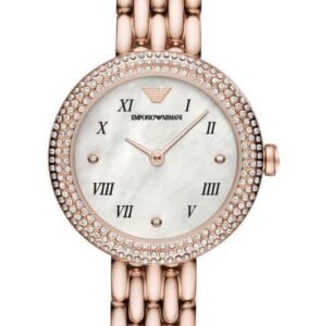 Zegarek damski Emporio Armani o modelu AR11355 to kwintesencja elegancji i nowoczesności, w której marka Emporio Armani znalazła idealne połączenie funkcjonalności z modowym szykiem. Pozłacana w odcieniu różowego złota, stal szlachetna użyta do wykonania koperty oraz bransolety dodaje luksusu, a jasna tarcza zdobiona masą perłową i cyrkoniami podkreśla wyrafinowanie i kobiecy charakter zegarka. Średnica koperty wynosi subtelną, a zarazem bardzo modną wielkość 30mm, idealnie komponując się na damskim nadgarstku. Taki design sprawia, że każdy szczegół tego zegarka jest odzwierciedleniem prestiżu marki Emporio Armani, co czyni go doskonałym wyborem dla wszystkich kobiet ceniących sobie modny, ale klasyczny styl.