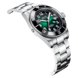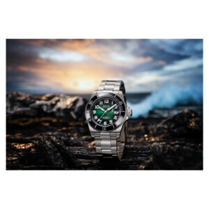 Zegarek męski Epos model 3504.131.80.33.90 to majstersztyk techniki i designu, skierowany do miłośników nurkowania. Jego wytrzymała koperta wykonana z tytanu oraz ceramiki, w połączeniu ze szlachetnie wykonaną, srebrną bransoletą, nadaje ekstra klasę i nowoczesny wygląd. Zielona tarcza z arabskimi cyframi kontrastuje z luminowymi wskazówkami i indeksami, zapewniając doskonałą czytelność nawet pod wodą. Wodoodporność na poziomie 500 metrów, zaawansowany zawór helowy, zakręcana koronka oraz obrotowy bezel podkreślają jego profesjonalizm dla nurków. Szafirowe szkło odporniejsze na zarysowania idealnie chroni zegarek, a datownik i system zmiany paska bez użycia narzędzi zwiększają jego funkcjonalność.