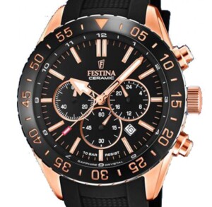 Męski zegarek Festina model F20516/2 to idealna propozycja dla panów ceniących połączenie sportowej dynamiki z elegancją. Charakteryzuje się on okrągłą kopertą o średnicy 44 mm, wykonaną z wysokiej jakości stali szlachetnej, dodatkowo wzbogaconą elementami ceramicznymi i pozłacanymi w odcieniu różowego złota metodą PVD/IP. Tarcza w ciemnym kolorze harmonizuje z czarnym, gumowym paskiem, co nadaje zegarkowi nowoczesny, ale jednocześnie wyrafinowany wygląd. Szkło szafirowe, odporne na zarysowania, oraz fluoryzujące wskazówki i indeksy dodają funkcjonalności, podkreślając sportowy, lecz elegancki charakter zegarka.