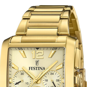 Zegarek męski Festina model F20638/2 łączy elegancję z nowoczesnością, co czyni go doskonałym wyborem dla panów ceniących sobie wysoką jakość i luksusowe wykończenie. Stal szlachetna pokryta żółtym złotem za pomocą technologii PVD/IP nadaje urządzeniu prestiżowy wygląd, a prostokątna koperta o średnicy 38 mm idealnie komponuje się z każdym eleganckim strojem. Jasna tarcza z fluoerscencyjnymi wskazówkami i indeksami zapewnia wygodę odczytu w różnych warunkach oświetleniowych, a bransoleta z zapięciem motylkowym gwarantuje komfort noszenia. Dodatkowo, funkcje takie jak chronograf i stoper zwiększają funkcjonalność zegarka, co czyni go nie tylko wykwintnym dodatkiem, ale także praktycznym narzędziem na co dzień.