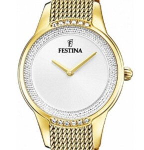 Zegarek damski Festina model F20495/1 to kwintesencja elegancji i prestiżu marki, znanej z doskonałej jakości i unikalnego designu. Posiadając okrągłą kopertę o średnicy 30 mm, wykonaną z najwyższej klasy stali szlachetnej, zegarek skutecznie łączy trwałość z subtelnością. Cyferblat w jasnym kolorze doskonale komponuje się z pozłacaną bransoletą w odcieniu żółtego złota, dzięki procesowi nanoszenia koloru metodą PVD/IP, który zwiększa odporność na ścieranie. Dodatkowym atutem są delikatne zdobienia kryształami, podkreślające wyrafinowany gust jego nosicielki. Mineralne szkło chroni zegarek przed zarysowaniami, a wodoodporność do 50 metrów gwarantuje funkcjonalność nawet podczas pływania powierzchniowego.