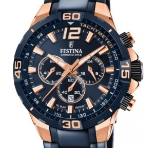 Zegarek męski Festina, model F20524/1, jest doskonałym wyborem dla mężczyzn ceniących sportowy styl i funkcjonalność. Elegancka okrągła koperta o średnicy 44mm, wykonana ze stali szlachetnej i pokryta metodą PVD/IP w kolorach niebieskim oraz różowego złota, podkreśla nowoczesny charakter zegarka. Niebieska tarcza współgra z pozłacanymi elementami, dodając klasę i wyrafinowanie. Wyróżniające się fluorescencyjne wskazówki i indeksy zapewniają doskonałą czytelność w każdych warunkach. Szafirowe szkło odporne na zarysowania oraz wodoodporność do 100m gwarantują niezawodność i trwałość, co potwierdza dwuletnia gwarancja. Funkcje takie jak chronograf, datownik oraz tachymetr nie tylko zwiększają praktyczność zegarka, ale także podkreślają jego sportowy charakter.