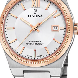 Zegarek męski Festina, model F20036/1, to kwintesencja elegancji i zaawansowanego designu. Wykonany z najwyższej jakości stali szlachetnej, który zapewnia trwałość i odporność, idealnie komponuje się z dwukolorową, srebrno-złotą kopertą o średnicy 40mm. Srebrna tarcza z liniowymi indeksami, pokryta nanoszeniem koloru PVD/IP, dodaje uroku i czytelności. Szafirowe szkło odporne na zarysowania oraz szczelność do 100m gwarantują nie tylko elegancki wygląd, ale i funkcjonalność w codziennym użytkowaniu. Festina, znaną z tradycji i precyzji, stworzyła zegarek, który doskonale uzupełni każdy męski strój, zachowując jednocześnie nowoczesny i wyrafinowany styl.