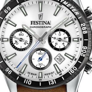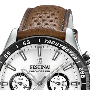 Zegarek męski Festina, model F20561/1, to wyjątkowe połączenie sportowej elegancji i wyrafinowanego designu, które uosabia renomowaną markę Festina. Stylowy zegarek posiada okrągłą kopertę o średnicy 45mm, wykonaną z trwałej stali szlachetnej, uzupełnioną o skórzany pasek w barwach od brązu po czarny i srebrny, co dodaje klasy każdemu strojowi. Jasna tarcza jest czytelna i funkcjonalna, wyposażona w chronograf, datownik oraz tachymetr. Minerlane szkło gwarantuje trwałość, a wodoodporność do 100m pozwala na bezproblemowe użytkowanie w różnorodnych warunkach. Wskazówki i indeksy fluorescencyjne zapewniają doskonałą widoczność nawet w ciemności, podkreślając sportowo-elegancki charakter tego zegarka.