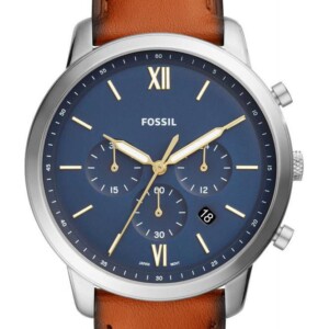 Zewnętrzna budowa zegarka Fossil FS5453 opiera się o okrągłą kopertę wykonaną z antyalergicznej i odpornej na korozję stali szlachetnej, a każde skórzany, brązowy pasek z przeszyciami. Co ciekawe, brąz mocowania idealnie komponuje się z granatowym cyferblatem, a połączenie to cieszy się obecnie wielkim zainteresowaniem na rynku fashion. Analogowa tarcza tego modelu zapewnia nam wszystko czego potrzebujemy aby być stale na czasie. Umieszczono na niej proste indeksy liniowe, które współpracują z fluorescencyjnymi wskazówkami. Dwie subtarcze, przy godzinie szóstej oraz dziewiątej, należą do funkcji chronografu, dzięki której możemy odmierzać czas. Subtarcza przy godzinie trzeciej określa czas w systemie 24- godzinnym, a datownik między indeksami godzin czwartek i piątej pokaże nam obecny dzień miesiąca. Jak przystało na modowe modele zegarek Fossil FS5453 wyposażono w szkło mineralne, które odpornością na stłuczenia stanowi idealną ochronę cyferblatu.