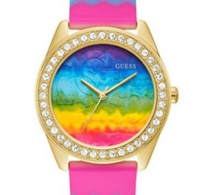 Zegarek damski Guess model GW0250L1 doskonale oddaje esencję stylu fashion, będącego synonimem luksusu i nowoczesności, które są charakterystyczne dla marki Guess. Okrągła koperta o średnicy 40 mm, wykonana z wysokiej jakości stali szlachetnej i pozłacana metodą PVD/IP w odcieniu żółtego złota, nadaje elegancki, ale jednocześnie zdecydowany charakter. Tarcza w ciemnym odcieniu harmonijnie kontrastuje z wielobarwnym wzorem oraz zniewalającymi zdobieniami z cyrkonii, co podkreśla unikalne piękno zegarka. Bransoleta, również wykonana ze stali szlachetnej, doskonale komponuje się z całością, tworząc efektowną całość idealną dla każdej kobiety ceniącej sobie zarówno funkcjonalność, jak i wyrafinowany design.
