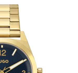 Zegarek męski Hugo model 1530252 to doskonałe połączenie elegancji i nowoczesności, idealnie wpisujące się w styl Fashion. Jego okrągła koperta o średnicy 42 mm wykonana ze stali szlachetnej, pozłacana metodą PVD w kolorze żółtego złota, dodaje wyrafinowania. Ciemna tarcza, zdobiona fluorescencyjnymi wskazówkami i indeksami, zapewnia doskonałą czytelność w każdych warunkach. Granatowy kolor w połączeniu z żółtym złotem podkreśla prestiż marki Hugo, znanej z dbałości o szczegóły. Mineralne szkło chroni zegarek przed zarysowaniami, a wodoodporność do 30 metrów gwarantuje ochronę przed przypadkowymi zachlapaniami, czyniąc ten zegarek nie tylko stylowym, ale i funkcjonalnym dodatkiem.