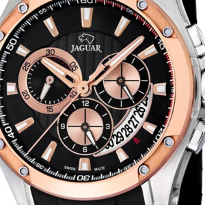 Zegarek męski Jaguar model J689/1 to wyjątkowa propozycja dla mężczyzn, którzy cenią sobie połączenie sportowej dynamiki z elegancją. Wykonany ze stali szlachetnej, z okrągłą, błyszczącą kopertą pokrytą nanoszeniem koloru PVD/IP i pozłacaną w odcieniach różowego złota, zegarek przyciąga wzrok swoją nowoczesną estetyką. Ciemna tarcza harmonizuje z czarnym, gumowym paskiem, nadając zegarkowi męski, wyrazisty charakter. Fluorescencyjne wskazówki i indeksy ułatwiają odczytywanie czasu w różnych warunkach oświetleniowych. Mineralne szkło zabezpiecza tarczę przed zarysowaniami, podnosząc trwałość zegarka, co w połączeniu z wodoodpornością do 100 metrów sprawia, że model J689/1 jest nie tylko stylowy, ale i praktyczny.
