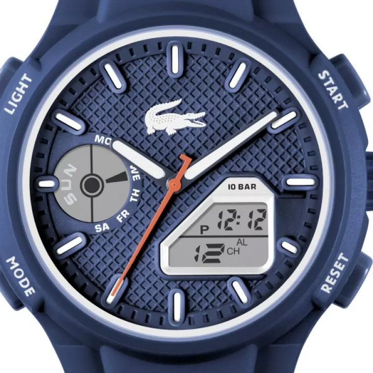 Model Lacoste 2011370 to zegarek, który łączy nowoczesną technologię z eleganckim designem, idealny dla każdego, kto ceni sobie zarówno funkcjonalność, jak i styl. Wyposażony w precyzyjny mechanizm kwarcowy zasilany baterią, zapewnia niezawodność i długotrwałą pracę. Błękitna tarcza harmonijnie komponuje się z niebieskim kolorem paska i koperty, a okrągła, solidna koperta o średnicy 44mm wraz z grubością 15mm tworzy doskonałe połączenie trwałości i współczesnego wyglądu. Wodoodporność do 100 metrów sprawia, że zegarek nadaje się do różnych aktywności wodnych bez użycia sprzętu do nurkowania. Dwa lata gwarancji i mineralne szkło dodatkowo potwierdzają jakość, jaką oferuje Lacoste. Zakup tego modelu u autoryzowanego sprzedawcy gwarantuje oryginalność i najlepsze standardy obsługi.