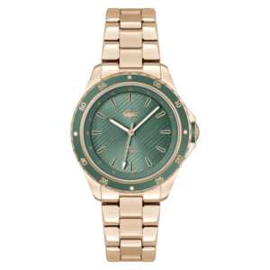 Zegarek damski marki Lacoste, model 2001372, to kwintesencja luksusu i nowoczesnego stylu, idealnie wpisująca się w modowy kanon *fashion*. Prezentowany model zachwyca elegancką bransoletą w kolorze różowego złota, której uzupełnieniem jest subtelne zielone wykończenie tarczy, nadające zegarkowi wyrazistego charakteru. Koperta o średnicy 36 mm, wykonana ze stali szlachetnej, podkreśla trwałość i jakość wykonania, zaś ciemna tarcza z szkłem mineralnym gwarantuje wytrzymałość i czytelność. Cechuje go nie tylko piękny design, ale także funkcjonalność na miarę oczekiwań współczesnych kobiet ceniących zarówno styl, jak i komfort.