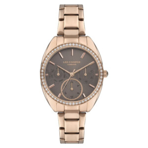 Damski zegarek Lee Cooper model LC07408.460 to kwintesencja elegancji i nowoczesnego designu w stylu Fashion. Jego okrągła koperta o średnicy 34 mm łączy w sobie mosiądz i stal szlachetną, podkreślając luksusowy charakter zegarka. Opalizująca tarcza w kolorze ciemnym harmonizuje z bransoletą w odcieniu różowego złota, która została pozłocona metodą PVD/IP, zapewniającą trwałość koloru. Zdobienia z błyszczących cyrkonii dodają uroku i blasku, a szkło mineralne chroni zegarek przed zarysowaniami. Lee Cooper, znana z dbałości o detale, w tym modelu stworzyła idealny dodatek dla każdej kobiety ceniącej sobie styl i jakość.