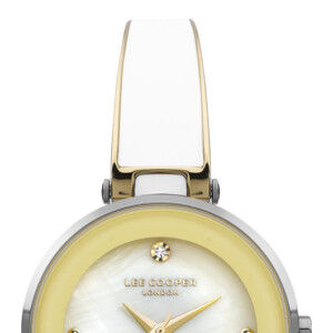 Zegarek damski Lee Cooper model LC07412.220 emanuje nie tylko wysmakowanym, modowym designem ale również symbolizuje szacunek do tradycji marki Lee Cooper. Jego okrągła, pozłacana koperta o średnicy 32 mm, wykonana z mosiądzu i stali nierdzewnej, prezentuje się elegancko i nowocześnie. Jasna tarcza ozdobiona masą perłową oraz cyrkoniami dodaje subtelnego blasku, podkreślającego klasyczne piękno. Bransoleta w kolorach białego, srebrnego i żółtego złota, z zastosowaniem technologii nanoszenia koloru PVD/IP, gwarantuje trwałość i elegancję, czyniąc ten zegarek idealnym wyborem dla każdej kobiety ceniącej style Fashion.