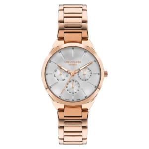 Elegancji i wyrafinowania dodaje zegarkowi damskiemu Lee Cooper, model LC07643.430, jego przypadający do gustu design w stylu fashion. Okrągła koperta o średnicy 36mm, atrakcyjnie prezentuje się na damskim nadgarstku. Wykonana została z wysokiej jakości stali szlachetnej, a jej lśniący wygląd w kolorze różowego złota, uzyskany dzięki technologii nanoszenia koloru PVD/IP, przyciąga spojrzenia. Równie zjawiskowo wygląda bransoleta, łącząca odcienie różowego złota i srebra, co dodatkowo podnosi estetyczny urok zegarka. Jasna tarcza, chroniona przez wytrzymałe szkło mineralne, zapewnia wygodę odczytu godziny, czyniąc z tego modelu nie tylko modny, ale i praktyczny dodatek.