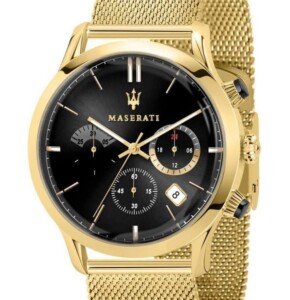 Zegarek męski Maserati model R8873633003 emanuje wyrafinowanym stylem Fashion, który doskonale podkreśla prestiż marki. Wykonana z wysokiej jakości stali szlachetnej okrągła koperta o średnicy 42mm, pokryta warstwą czarnego i żółtego złota dzięki technologii PVD/IP, zwraca uwagę swoim ekskluzywnym wyglądem. Ciemna tarcza z fluoryzującymi wskazówkami i indeksami gwarantuje doskonałą czytelność, a solidna bransoleta z zapięciem motylkowym zapewnia komfort noszenia i elegancję. Łącząc funkcjonalność z estetyką, ten model Maserati jest idealnym wyborem dla mężczyzny ceniącego luksus i nowoczesność w jednym.