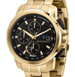 Maserati SUCCESSO R8873645002 to wspaniały model o niezwykle efektownym wzornictwie. Czarna tarcza jest tłem dla delikatnych złotych elementów, oraz drobnych oznaczeń pomocnych do odczytywania odpowiednich parametrów. Złota polerowana koperta, oraz bransoleta stanowią, błyskotliwy i olśniewający walor. Zegarek Maserati SUCCESSO, to model przeznaczony dla mężczyzny lubiącego blask złota, który zwraca uwagę wszystkich dookoła. Ten wspaniały model w stylu fasion, posiada wiele dodatkowych właściwości które zapewnią komfortowe i bardzo wygodne użytkowanie.Zegarek Maserati SUCCESSO R8873645002 został wykonany z najlepszych materiałów, dających pewność długotrwałego i wygodnego użytkowania. Wodoodporność do 50 m, zapewnia bezpieczeństwo dla delikatnego mechanizmu kwarcowego, przy zachlapaniu oraz powierzchniowym pływaniu. Wbudowany panel słoneczny pozwoli na znaczne wydłużenie pracy baterii a tym samym zadba o ekologię. Model Maserati SUCCESSO stworzony jest dla mężczyzny pełnego dobrej energii i pozytywnego myślenia.