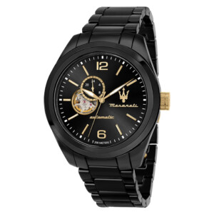 Męski zegarek Maserati R8823150001 emanuje wyrafinowanym stylem, który doskonale odzwierciedla wartości marki słynącej z wyjątkowego designu i luksusu. Okrągła koperta o średnicy 45mm, wykonana z wysokogatunkowej stali szlachetnej w połączeniu z ceramiką, utrzymana w eleganckiej kolorystyce czarnego i żółtego złota, prezentuje się niezwykle dostojnie. Automatyczny mechanizm z wahnikiem, szafirowe szkło odporne na zarysowania oraz bransoleta tego zegarka gwarantują nie tylko precyzję, ale i trwałość, podkreślając jego fashionowy charakter. Dodatkowo, wodoodporność do 200m i tarcza z fluorescencyjnymi wskazówkami czynią z tego modelu idealnego towarzysza nawet dla najbardziej wymagających mężczyzn.