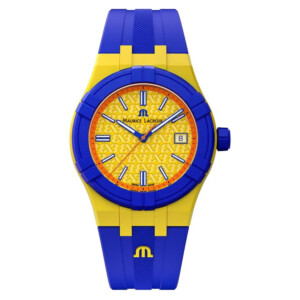 Zegarek męski Maurice Lacroix, model AI2008-68YZ8-800-0, idealnie oddaje filozofię marki, która łączy nowoczesność z elegancją. Ciemna tarcza i sportowo-elegancki styl zegarka są podkreślone przez unikalną kombinację fioletowych i żółtych detali, co sprawia, że model ten wyróżnia się na tle klasycznych zegarków. Wykonany z trwałego tworzywa sztucznego z okrągłą kopertą o średnicy 40 mm, jest zarówno wytrzymały, jak i stylowy. Szafirowe szkło odporne na zarysowania zapewnia zegarkowi długotrwały blask, a wodoodporność do 100 metrów umożliwia jego użytkowanie nawet podczas nurkowania bez aqualungu. Gumowy pasek zapewnia komfort noszenia oraz odporność w trudnych warunkach, czyniąc ten zegarek idealnym towarzyszem zarówno podczas eleganckich wieczorów, jak i sportowych wyzwań.