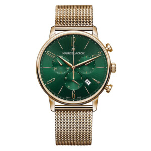 Model EL1098-PVP06-620-1 marki Maurice Lacroix idealnie łączy elegancję z wyrafinowanym stylem. Ekskluzywny design z okrągłą, 40-milimetrową kopertą wykonaną ze stali szlachetnej, pokrytą różowym złotem nadaje prestiżowego charakteru. Zielona, jasna tarcza przyciąga uwagę, wprowadzając cudowny kontrast barw, który z pewnością wyróżni każdego użytkownika. Stalowa bransoleta dodatkowo podkreśla uniwersalny, elegancki charakter zegarka, czyniąc go idealnym wyborem dla osób ceniących sobie luksus i wysoką jakość wykonania. Technicznie zaawansowany zegarek Maurice Lacroix EL1098-PVP06-620-1 jest wyposażony w niezawodny kwarcowy mechanizm zasilany baterią, co zapewnia dokładne i bezproblemowe odmierzanie czasu. Model ten jest wodoodporny do 50 metrów, dzięki czemu nadaje się do powierzchniowego pływania, a dodatkowe funkcje takie jak chronograf i datownik zwiększają jego praktyczność. Wytrzymałe szkło szafirowe skutecznie chroni przed zarysowaniami, zachowując nienaganny wygląd na długo. Gwarancja na 2 lata zapewnia spokój ducha, co potwierdza, że purchasing przez autoryzowanego sprzedawcę gwarantuje oryginalność oraz najwyższą jakość zegarka.Specyfikacja czasomierza Maurice Lacroix ELIROS EL1098-PVP06-620-1 - zegarek unisex