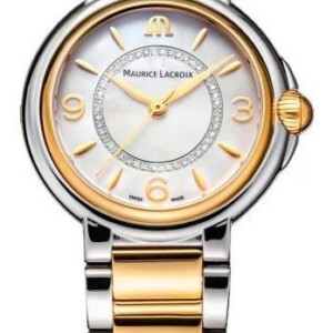 Zegarek damski Maurice Lacroix model FA1104-SSY13-B20-1 jest doskonałym przykładem elegancji i klasy, które wyznaczają standardy marki. Jego jasna tarcza harmonijnie komponuje się z luksusową bransoletą wykonaną ze stali szlachetnej, a subtelne zdobienia z brylantów dodają wyjątkowego blasku. Okrągła, 32-milimetrowa koperta idealnie wpisuje się w trend delikatnych i kobiecych akcesoriów. Szkło szafirowe, charakteryzujące się wysoką odpornością na zarysowania, oraz zapięcie motylkowe podnoszą komfort użytkowania, zapewniając trwałość i bezpieczeństwo na każdym kroku. Ten elegancki czasomierz, przyciągający uwagę swoim srebrno-żółtym połyskiem, jest wyraźnym symbolm prestiżu, jakim cieszy się marka Maurice Lacroix.