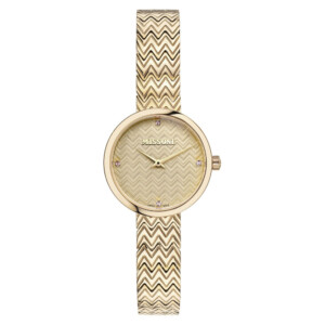 Zegarek damski Missoni model MWY100920 to doskonały przykład elegancji i prestiżu, które są synonimem marki Missoni. Delikatna, jasna tarcza doskonale komponuje się z żółtozłotą bransoletą, wykonaną z pozłacanej stali szlachetnej metodą PVD/IP, co zapewnia trwałość i stylowy blask. Okrągła koperta o średnicy 29mm podkreśla klasyczny charakter, zaś szafirowe szkło odporne na zarysowania gwarantuje trwałość i czytelność. Stal szlachetna zapewnia komfort noszenia i elegancję na każdą okazję. Cechy te razem z delikatną wodoodpornością do 30 metrów czynią ten model idealnym wyborem dla kobiet ceniących sobie luksus i niezawodność.