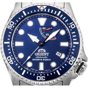 Zegarek RA-EL0002L00B Orient dzięki granatowej tarczy jest bardzo czytelny. Wskazówki są w kolorze białym, kontrastują na tarczy i umożliwiają łatwy odczyt godziny. W górnej części tarczy umieszczono logo marki. W modelu tym zastosowano szkiełko mineralne, wykonane na bazie krzemu, które bardzo dobrze sprawdza się nawet w codziennym użytkowaniu. RA-EL0002L00B posiada odporność na wodę na poziomie 20 ATM, co oznacza, że zegarek pozwala na nurkowanie z aqualungiem.