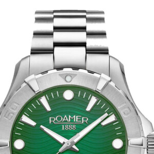 Zegarek męski Roamer o numerze modelu 860833 41 75 71 jest wyrafinowaną propozycją dla pasjonatów nurkowania i elegancji. Stworzony ze stali szlachetnej z błyszczącym srebrnym paskiem i kopertą, wyróżnia się swoją trwałością oraz minimalistycznym designem. Zielona tarcza z giloszowanym wzorem dodaje głębi, a różnorodne indeksy na tarczy wraz z obrotowym bezel są nie tylko praktycznymi, lecz także stylowymi detalami. Średnica koperty wynosi 43mm, a grubość 11mm, co sprawia, że zegarek jest solidny, lecz nie przytłaczający. Wodoszczelność do 200m oraz funkcje takie jak datownik, zakręcana koronka czy zakręcany dekiel podkreślają jego funkcjonalność w trudniejszych warunkach. Luminova na wskazówkach oraz indeksach zapewnia doskonałą czytelność pod wodą.