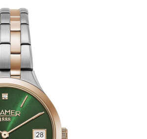 Zegarek damski marki Roamer, model 864857 49 75 50, jest kwintesencją elegancji, która harmonijnie łączy nowoczesność z klasycznym pięknem. Bicolorowa bransoleta z pozłacanymi w różowym złocie elementami oraz srebrną stalą szlachetną przyciąga wzrok i dodaje szyku. Okrągła koperta o średnicy 30mm idealnie komponuje się z ciemną tarczą, której szafirowe szkło oprócz wyrafinowanego wyglądu gwarantuje wysoką odporność na zarysowania. Zielone akcenty na tarczy wzbogacają design, sprawiając, że zegarek jest doskonałym wyborem dla kobiet ceniących zarówno funkcjonalność, jak i estetyczny detal. Elegancki styl tego modelu Roamer sprawia, że może on stać się nie tylko miarą czasu, ale prawdziwą ozdobą w każdej sytuacji.