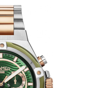 Elegancki męski zegarek Roamer o modelu 221837 49 75 20 wyróżnia się swoją wyjątkowo wyszukaną estetyką, będąc reprezentacją luksusu i precyzyjnego wykonania. Jego okrągła koperta o średnicy 42mm wykonana ze stali szlachetnej, zdobiona techniką PVD/IP oraz pozłacana w odcieniach różowego złota, dodają prestiżu i subtelnej klasy. Bicolorowa tarcza w kolorach srebrnym i zieleni z fluo-rescencyjnymi wskazówkami oraz indeksami uczyni go zauważalnym nawet przy słabym oświetleniu. Szafirowe szkło zapewnia wytrzymałość na zarysowania, a zapięcie motylkowe gwarantuje komfort noszenia przy zachowaniu eleganckiego wyglądu. Wodoszczelność do 100m oraz klasyczny, elegancki design sprawiają, że zegarek Roamer to doskonały wybór dla każdego mężczyzny ceniącego tradycję połączoną z nowoczesnością.