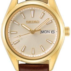 Seiko, renomowana marka zegarków, przedstawia model SUR456P1, który łączy w sobie elegancję oraz wysoką jakość wykonania. Ten damski zegarek charakteryzuje się okrągłą kopertą o średnicy 30 mm, wykonaną z żółtego złota oraz stali szlachetnej, co nadaje mu luksusowego wyglądu. Brązowy, skórzany pasek doskonale komplementuje jasną tarczę, tworząc klasyczny, ale zarazem wyrafinowany design. Szafirowe szkło odporne na zarysowania oraz wodoodporność do 100 m sprawiają, że zegarek jest nie tylko piękny, ale również funkcjonalny i trwały. Seiko SUR456P1 to wybór dla kobiet ceniących trwałość oraz ponadczasową elegancję.