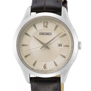 Seiko Classic SUR427P1 - jest to fantastyczna propozycja dla kobiet, które cenią sobie klasyczne modele zegarków, które wykonane zostały na pasku ze skóry naturalnej. Takie wykonanie z pewnością nadaje urządzeniu ogromnej elegancji i szyku, a te cechy na pewno ceni sobie każda Pani. Czasomierz ma wiele cech, które nadają mu unikatowego wyglądu, odróżniającego się od innych zegarków konkurencyjnych.Gilszowana, beżowa tarcza modelu Seiko Classic SUR427P1 pokryta została szkiełkiem szafirowym, odpornym na wszelkiego rodzaju zarysowania. Na cyferblacie znajdują się indeksy ułatwiające odczytywanie godzin a także datownik, wskazujący obecny dzień miesiąca. Na skórzanym pasku koloru brązowego umieszczono subtelną kopertę, wykonaną za pomocą stali szlachetnej nierdzewnej. Pracę produktu napędza mechanizm kwarcowy Seiko 6N22, który jest bardzo dokładny oraz zasilany wytrzymałą baterią. Wodoszczelność klasy 100 metrów sprawia, iż pływanie powierzchniowe wraz z zegarkiem na nadgarstku nie niesie za sobą ryzyka zalania mechanizmu.