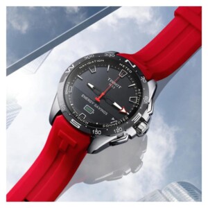 T-Touch Connect Solar T121.420.47.051.01 - zegarek męski to produkt innowacyjny. Jest on zasilany energią słoneczną, dzięki czemu jest pewnego rodzaju nawiązaniem do natury. Produkt jest fuzją kunsztu zegarmistrzowskiej tradycji oraz zoptymalizowanych rozwiązań. Warto wiedzieć, że zegarek jest wyposażony w ogniwa fotowoltaiczne najnowszej generacji, dzięki czemu stale posiada on rezerwę chodu. W związku z tym z zegarka w trybie offline można korzystać aż przez sześć miesięcy w zależności od natężenia użytkowania oraz dostępności do światła słonecznego. Należy wiedzieć, że dzięki zastosowaniu odpowiednich materiałów podczas produkcji opisywany zegarek jest całkowicie hipoalergiczny. Tytan, z którego zrobiono większość elementów zegarka odpowiada za jego wysoką odporność oraz trwałość. Cała obudowa jest zawieszona na czerwonum pasku, który wspaniale się prezentuje. Opisywany zegarek wygląda bardzo dobrze zarówno w połączeniu ze sportowymi stylizacjami, jak i z casualowymi noszonymi na co dzień.
